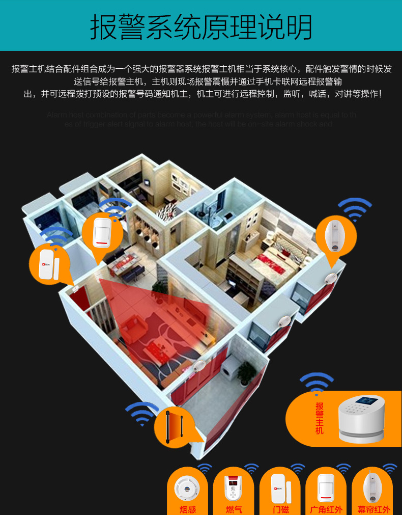 商品名称:红外线感应防盗报警器电话线手机卡无线WIFI三网家用店铺安防系统